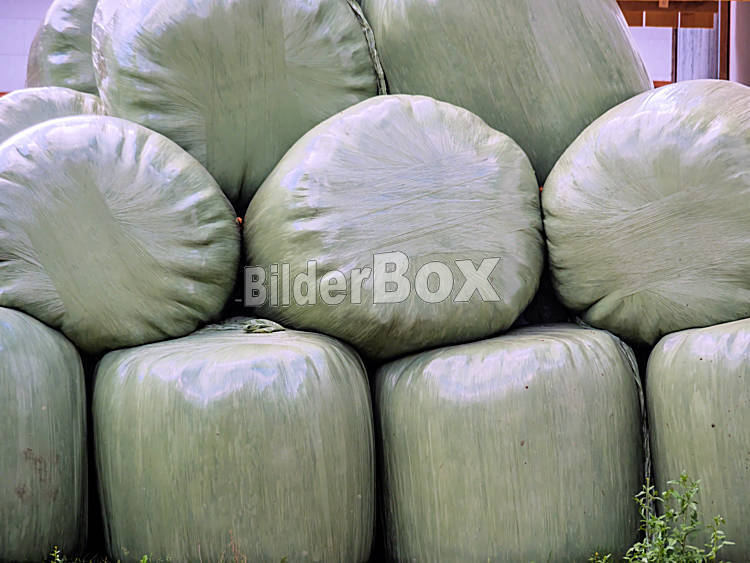 Beschreibung Ein Landwirt hat Futterballen für den Winter gestapelt