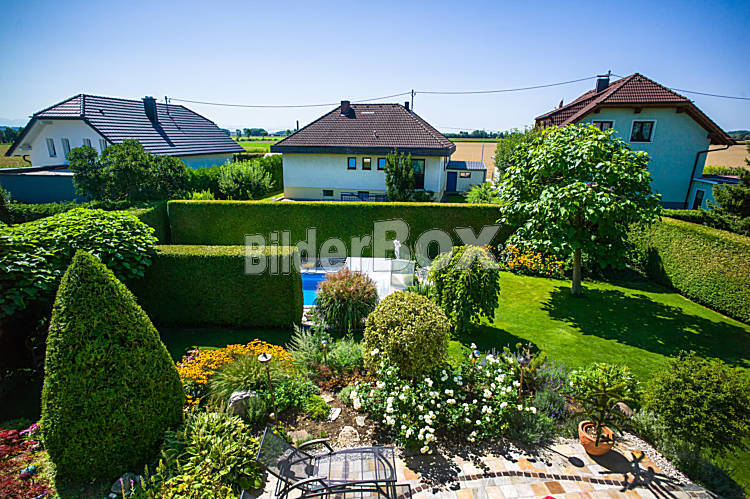 Beschreibung Der Garten mit Schwimmbad eines Einfamilienhauses. Raumordnung und Nachbarschaft