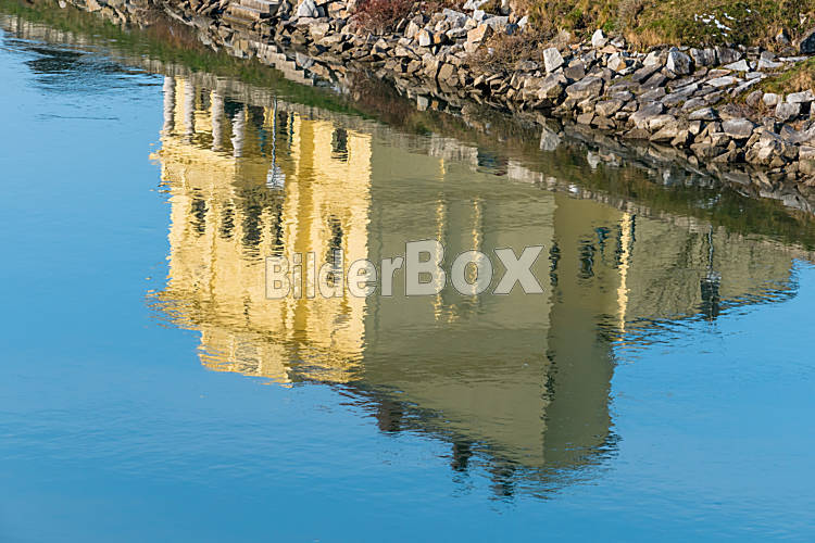 Beschreibung Gebäude spiegelt sich im Wasser, Symbol für Ruhe, Idylle, Meditation