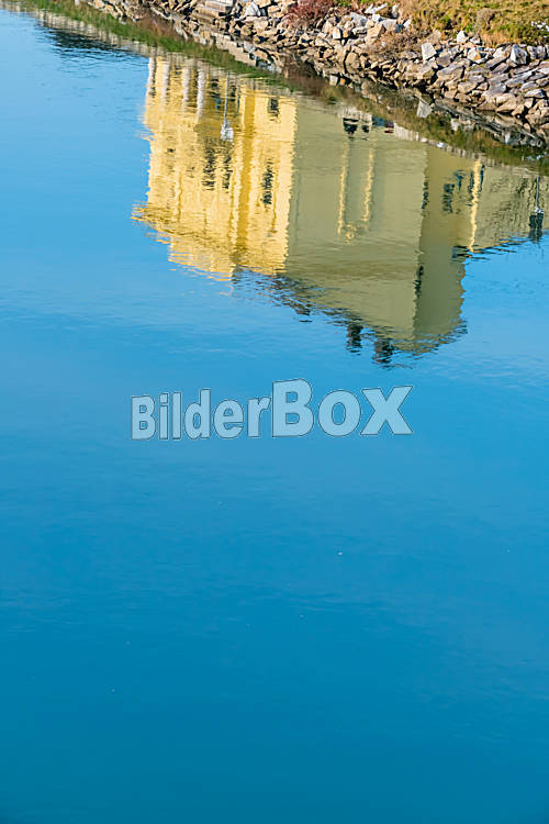 Beschreibung Gebäude spiegelt sich im Wasser, Symbol für Ruhe, Idylle, Meditation