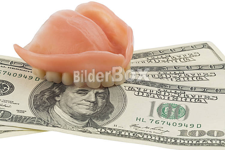 Beschreibung Gebiss und Dollarscheine, Symbolfoto für Zahnersatz, Behandlungskosten und Zuzahlung