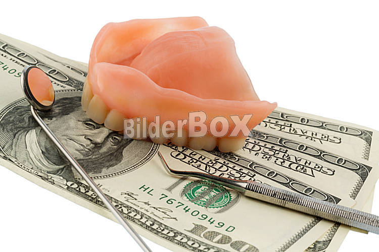 Beschreibung Gebiss und Dollarscheine, Symbolfoto für Zahnersatz, Behandlungskosten und Zuzahlung