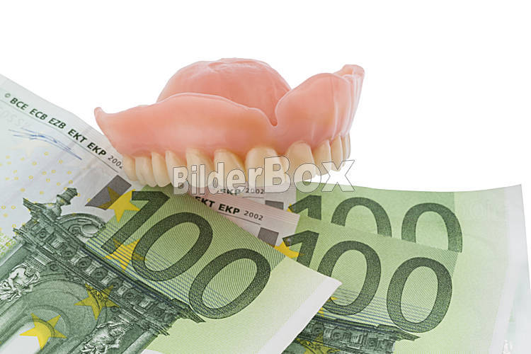 Beschreibung Gebiss und Euroscheine, Symbolfoto für Zahnersatz, Behandlungskosten und Zuzahlung