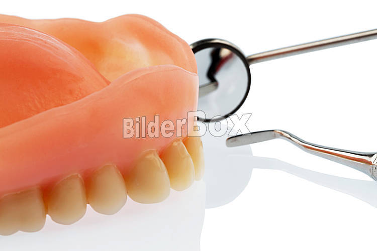 Beschreibung Gebiss und Mundspiegel, Symbolfoto für Zahnersatz, Diagnostik und Zuzahlung