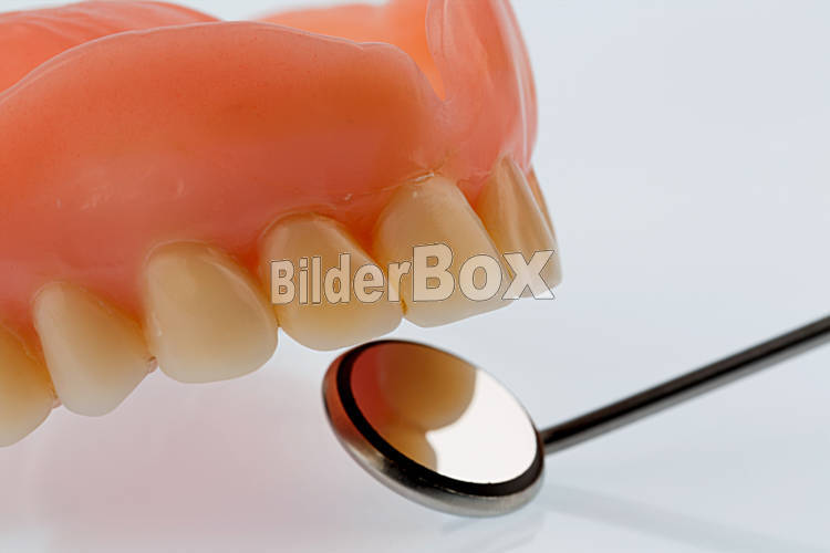 Beschreibung Gebiss und Mundspiegel, Symbolfoto für Zahnersatz, Diagnostik und Zuzahlung