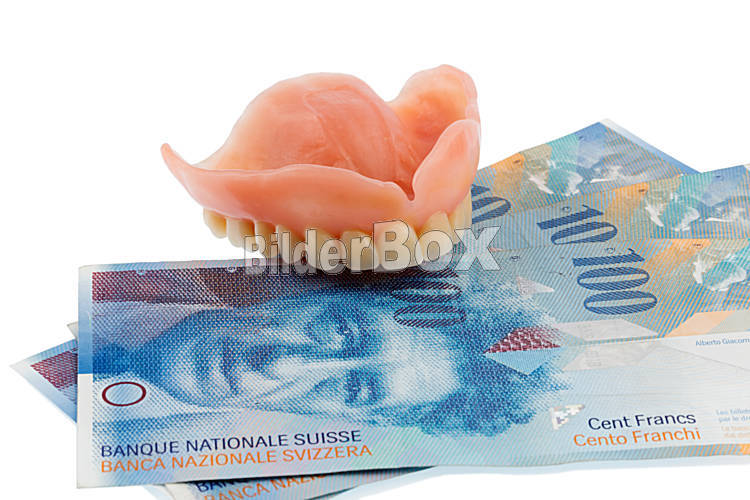Beschreibung Gebiss und Schweizer Franken Symbolfoto für Zahnersatz, Behandlungskosten und Zuzahlung