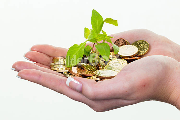 Beschreibung Hände mit Geld und Pflanze. Symbolfoto für wachsendes Kapital surch Zinsen beim Sparen.