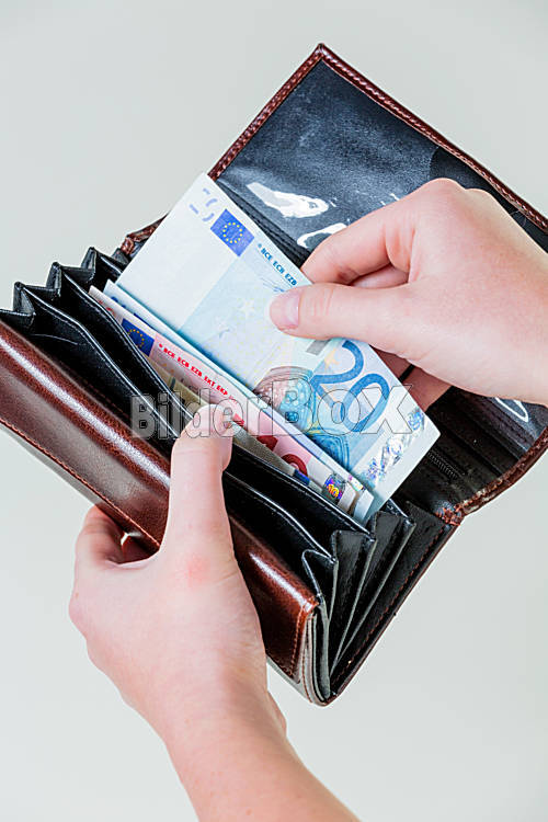 Beschreibung In einer Geldbörse befinden sich einige Euro-Geldscheine. Geld wird durch die neue Armut knapp.