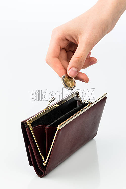 Beschreibung Eine leere Geldbörse und eine Hand die eine Münze hält vor weißem Hintergrund