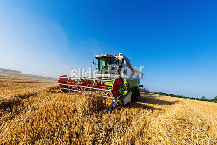 Beschreibung Ein Getreidefeld mit Weizen bei der Ernte. Ein Mähdrescher bei der Arbeit.