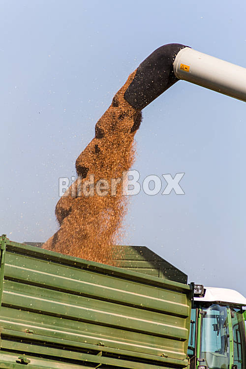 Beschreibung Ein Getreidefeld mit Weizen bei der Ernte. Ein Mähdrescher bei der Arbeit.