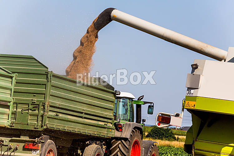 Beschreibung Ein Getreidefeld mit Weizen bei der Ernte. Ein Mähdrescher bei der Arbeit.