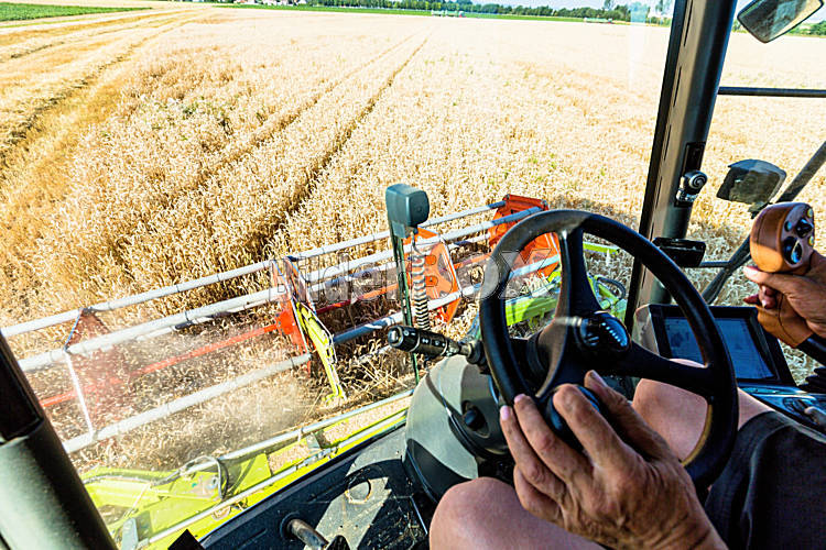 Beschreibung Ein Getreidefeld mit Weizen bei der Ernte. Ein Mähdrescher bei der Arbeit.