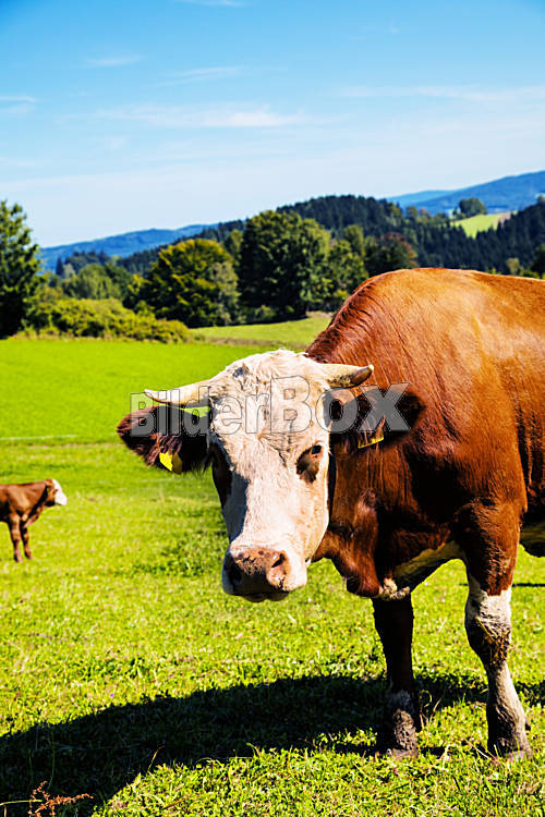 Beschreibung Eine glückliche Kuh beim grasen auf der Weide. Tierhaltung in der Landwirtschaft
