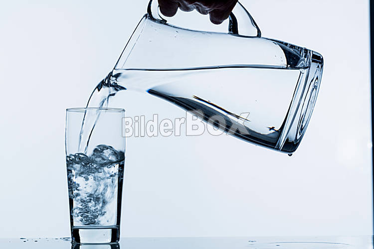 Beschreibung Reines Wasser wird in ein Wasserglas aus einem Krug eingeleert. Frisches Trinkwasser