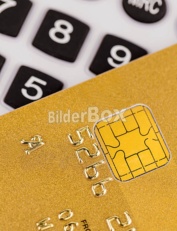 Beschreibung Eine goldene Kreditkarte und ein Taschenrechner. Symbolfoto für bargeldloses Einkaufen und Statussymbole.