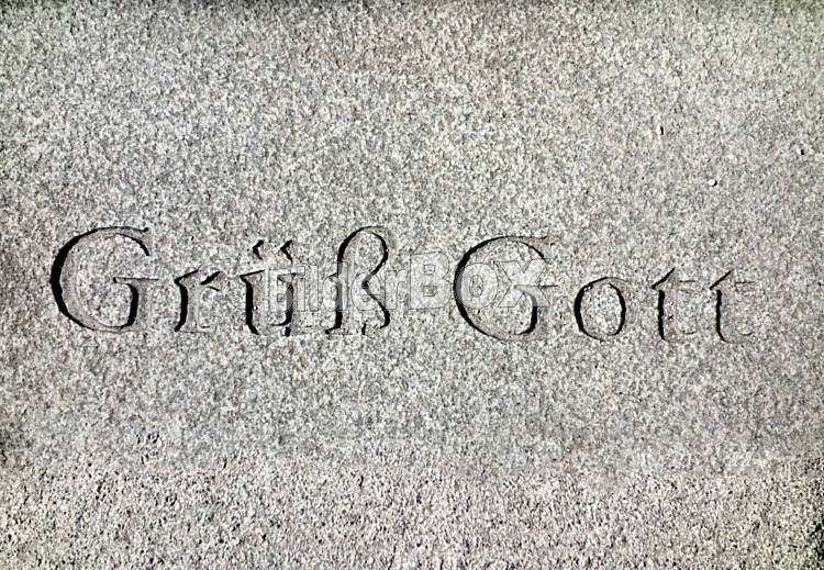 Beschreibung Der Schriftzug "Grüß Gott" in Stein gemeisselt. Begrüßung und Religion