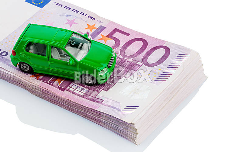Beschreibung Grünes Modellauto auf Geldscheinen, Symbolfoto für Autokauf, Finanzierung und Kosten