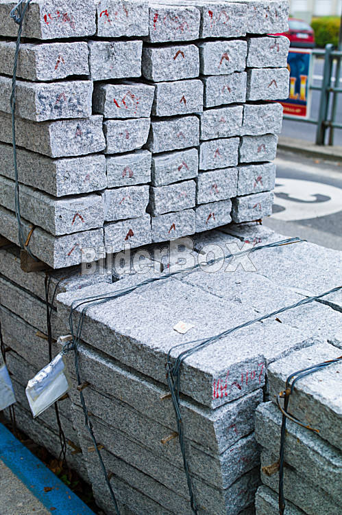 Beschreibung Steine aus Granit für Pflasterung einer Straße auf einer Straßenbaustelle