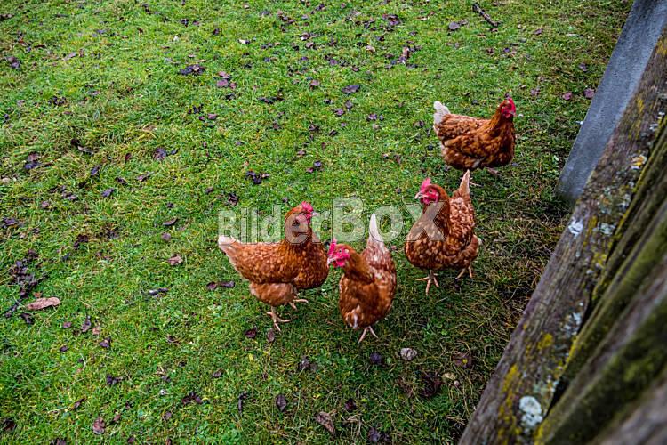 Beschreibung Hühner in Freilandhaltung, Symbol für Landwirtschaft, artgerecht, Landleben