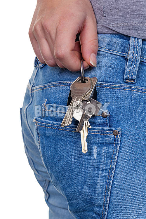 Beschreibung Die Hand einer jungen Frau in Jeans mit Schlüsselbund. Schlüssel für Auto und Wohnung