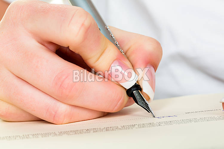 Beschreibung Eine Frau unterschreibt einen Vertrag oder ein Testament mit einer Füllfeder.