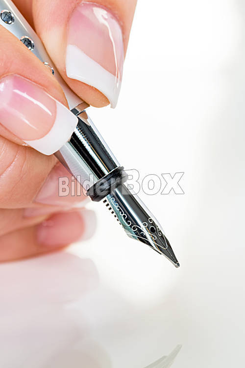 Beschreibung Eine Frau unterschreibt einen Vertrag oder ein Testament mit einer Füllfeder.