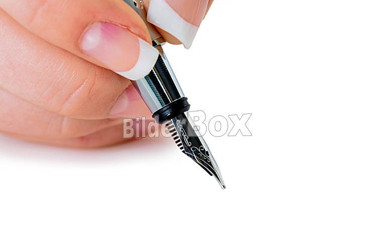 Beschreibung Eine Frau unterschreibt einen Vertrag oder ein Testament mit einer Füllfeder.