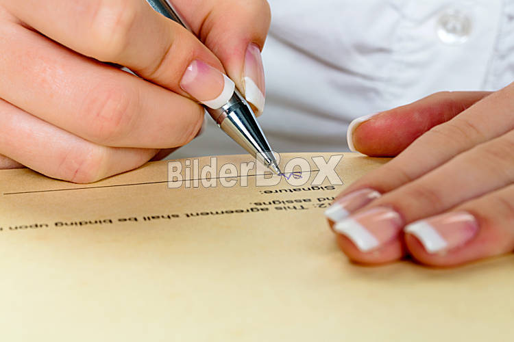 Beschreibung Hand mit Füllfeder unterschreibt Vertrag. Frau beim unterzeichnen