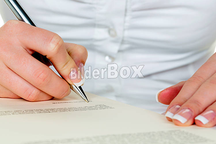 Beschreibung Hand mit Füllfeder unterschreibt Vertrag. Frau beim unterzeichnen