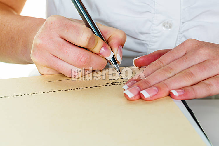 Beschreibung Eine Frau unterschreibt einen Vertrag oder ein Testament mit einer Füllfeder.