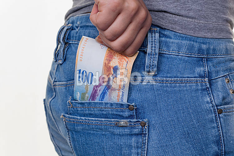 Beschreibung Die Hand einer jungen Frau zieht einen Schweizer Franken Geldschein aus der Tasche ihrer Jeans