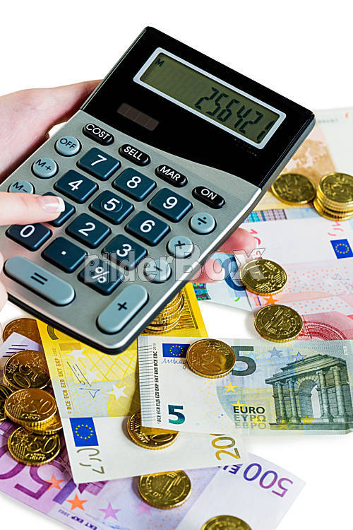 Hand mit Taschenrechner und Geld