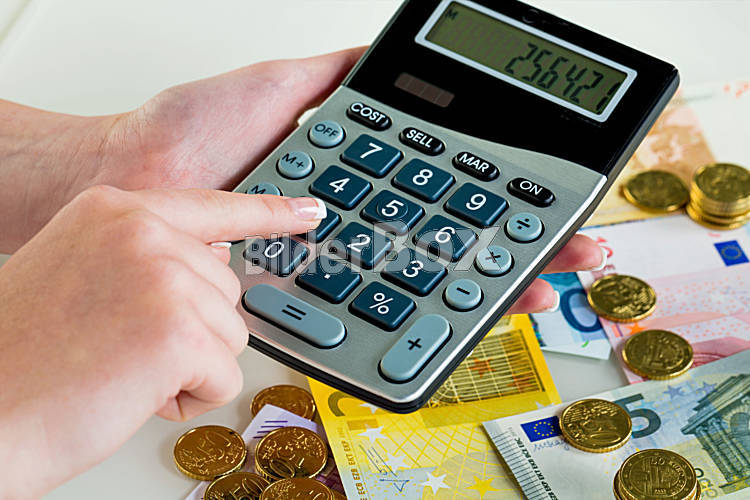 Hand mit Taschenrechner und Geld