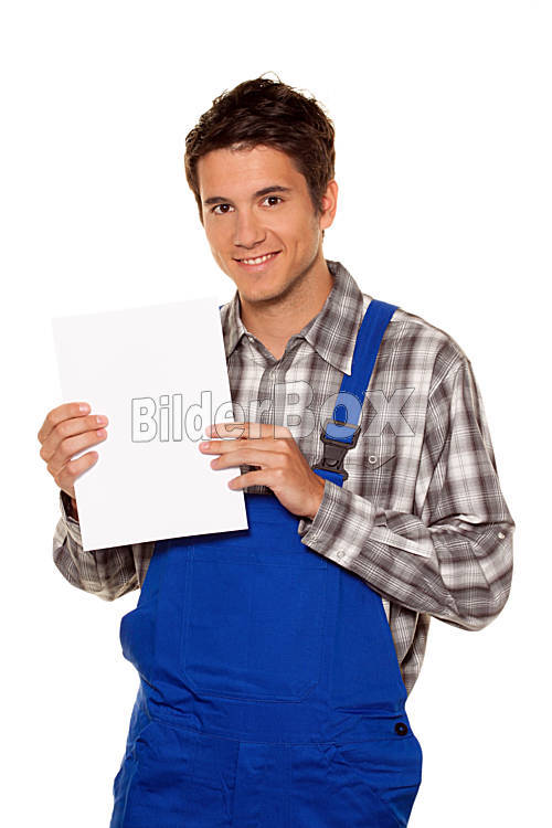 Beschreibung Ein junger Handwerker, Klemptner, Bauarbeiter mit leerem Poster