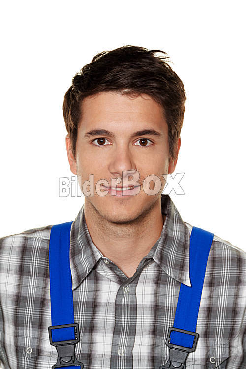 Beschreibung Junger Handwerker - Klemptner - Bauarbeiter vor weißem Hintergrund