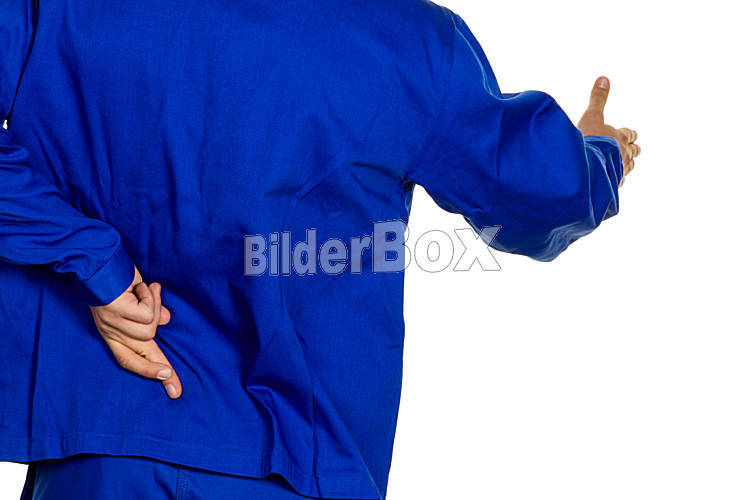 Beschreibung Ein Handwerker kreuzt die Finger hinter seinem Rücken. Lüge und Unwahrheit im Gewerbe.