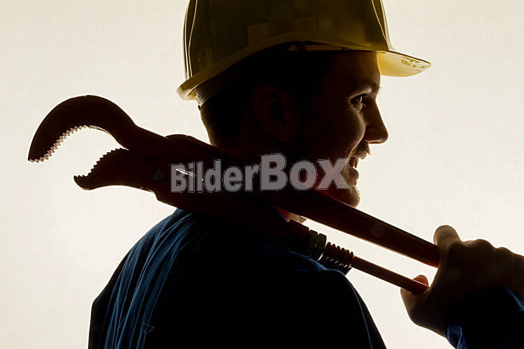 Beschreibung Arbeiter in einem Gewerbebetrieb mit Helm vor weißem Hintergrund