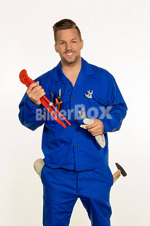 Beschreibung Arbeiter in einem Gewerbebetrieb mit Helm vor weißem Hintergrund
