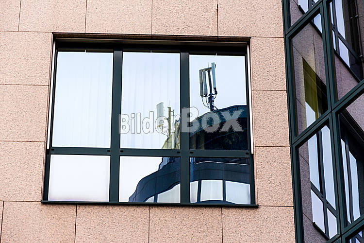 Beschreibung Der Mobilfunksender eines Mobilfunkbetreibers spiegelt sich in einem Fenster. Handysender und Elektrosmog