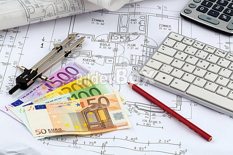 Beschreibung Ein Bauplan eines Architekten mit Eurogeld. Symbolfoto für Finanzierung und Planung eines neuen Hauses.