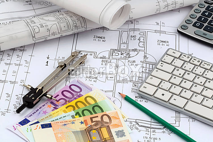 Beschreibung Ein Bauplan eines Architekten mit Eurogeld. Symbolfoto für Finanzierung und Planung eines neuen Hauses.