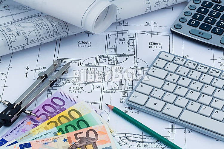 Beschreibung Ein Bauplan eines Architekten mit Eurogeld. Symbolfoto für Finanzierung und Planung eines neuen Hauses.
