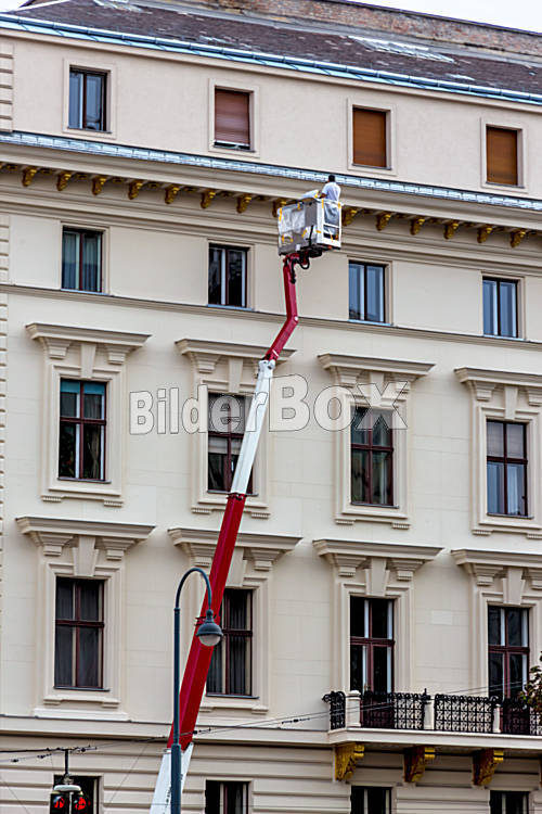Beschreibung Hebebühne an einem Wohnhaus, Symbol für Reparatur, Instandhaltung, Gebäudemanagement