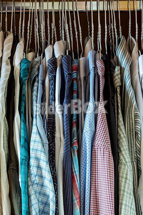 Beschreibung Schlafzimmerkasten mit Herrenhemden auf Kleiderbügeln, Auswahl und Ordnung