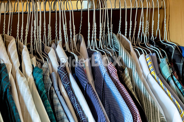 Beschreibung Schlafzimmerkasten mit Herrenhemden auf Kleiderbügeln, Auswahl und Ordnung