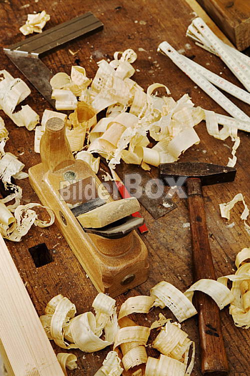 Beschreibung Ein Hobel in einer Schreiner Werkstatt. Werkzeuge in einer Tischlerei.