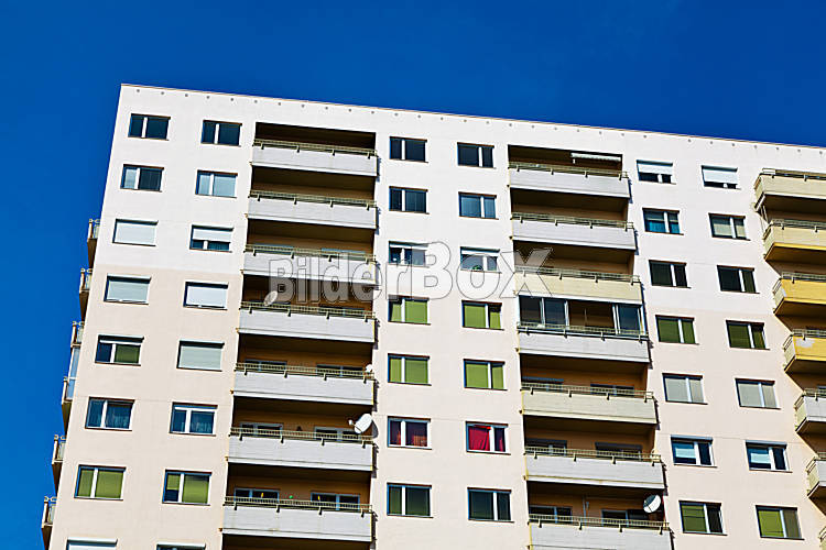Beschreibung Ein Hochhaus als Wohnhaus mit Balkonen in einer Stadt