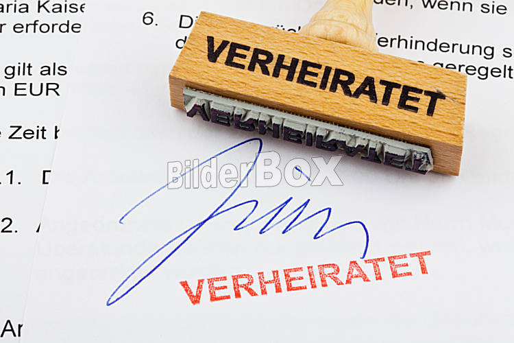 Beschreibung Ein Stempel aus Holz liegt auf einem Dokument. Deutsche Aufschrift: Verheiratet