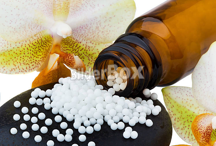 Beschreibung Homöopathie. Globuli als alternative Medizin. Liegen auf einem Stein.